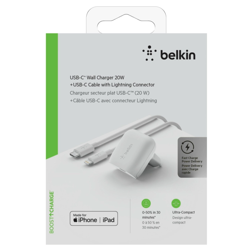 شارژر دیواری بلکین مدل WCA003vf04WH 20W به همراه کابل USB-C به لایتنینگ