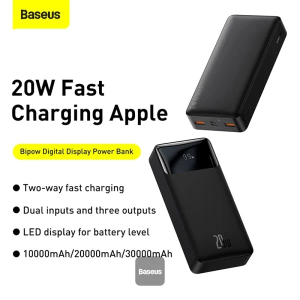 پاوربانک Baseus Bipow Digital Display از تولیدات کمپانی مطرح بیسوس است که با داشتن ظرفیت 20000 میلی آمپر ساعت یک منبع تغذیه انرژی قابل اعتماد است.