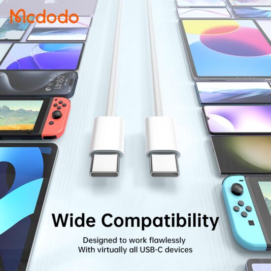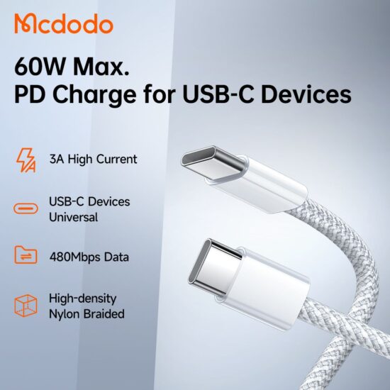 کابل شارژ تایپ سی به تایپ سی 60 وات مک دودو مدل CA-5690 با 100 سانتیمتر طول برای استفادههای روزمره بسیار مناسب است. این کابل بدنهای بسیار مقاوم دارد و برای سالهای طولانی قابل استفاده است. همچنین دارای گواهینامه های ایمنی CE / RoHS بوده و از تکنولوژی فست شارژ PD پشتیبانی میکند.